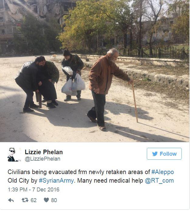«Πολλοί από αυτούς τους ανθρώπους δεν έχουν δει τους συγγενείς τους για πάνω από τέσσερα χρόνια», πρόσθεσε η Λίζι Φέλαν μεταξύ άλλων. Εν τω μεταξύ, συριακές κυβερνητικές δυνάμεις έχουν λάβει δέκα επαρχίες στο ανατολικό Χαλέπι κατά τη διάρκεια των τελευταίων 24 ωρών, ενώ σαράντα-πέντε συνοικίες τώρα λέγεται ότι είναι υπό τον έλεγχο του συριακού στρατού.