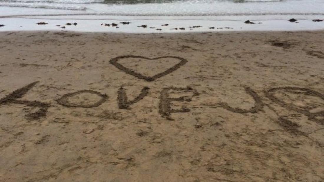 Μήνυμα αγάπης στην άμμο στην παραλία Πόρτομπέλο του Σκάρμπορο