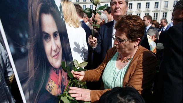 Κόσμος αφήνει ένα λουλούδι στη φωτογραφία της Τζο Κοξ έξω από το κτίριο της Εθνοσυνέλευσης στο Παρίσι
