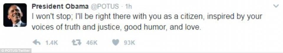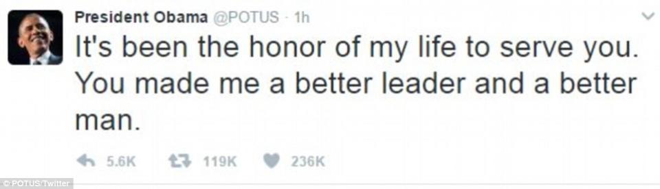 "Ήταν η μεγαλύτερη τιμή της ζωής μου που σας υπηρέτησα. Με κάνατε καλύτερο ηγέτη και καλύτερο άνθρωπο" έγραψε ο 44ος πρόεδρος των ΗΠΑ χρησιμοποιώντας τον επίσημο προεδρικό λογαριασμό (@POTUS) στο Twitter, τον οποίο θα παραδώσει επίσης στον Τραμπ.