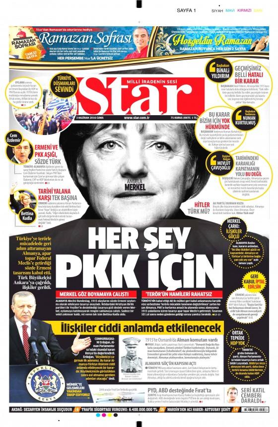 Η ''Star'' που δείχνει την Μέρκελ ως Χίτλερ αναφέρει: Όλα για το PKK. Η Γερμανία που δεν κατάφερε να υποχωρήσει την Τουρκία στο θέμα της καταπολέμησης της τρομοκρατίας τώρα ενέκρινε αυτό το ψήφισμα για τους Αρμένιους.