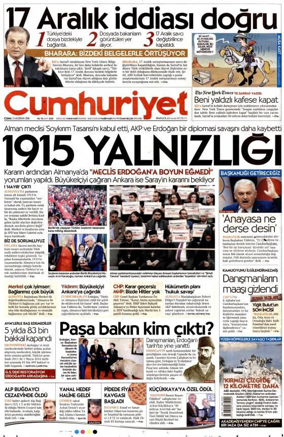 Η CUMHURIYET γράφει: Η μοναξιά του 1915. Η Γερμανία ενέκρινε το ψήφισμα για τους Αρμενιους. Ο Ερντογάν και το επιτελείο του έχασαν αλλη μια διπλωματική μάχη.