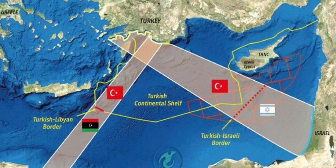 Συγκεκριμένα το πρακτορείο ειδήσεων EHA MEDYA που ελέγχεται από την Τουρκική Κυβέρνηση παρουσίασε τον πιο κάτω χάρτη στην παράλογη προσέγγιση της πλάγιας οριοθέτησης της Τουρκίας με Λιβύη-Ισραήλ, σημειώνοντας: