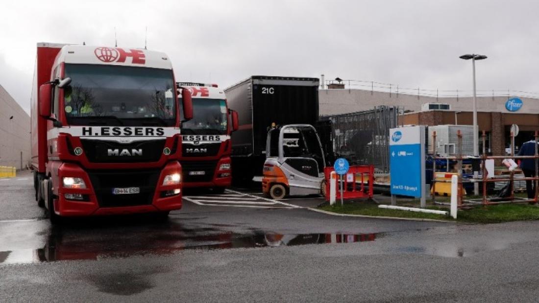 Φορτηγά ψυγεία φορτωμένα με τις παρτίδες των εμβολίων ξεκινούν από το εργοστάσιο της Pfizer και αναχωρούν υπό αστυνομική συνοδεία προς κατευθύνσεις που δεν αποκαλύπτονται.