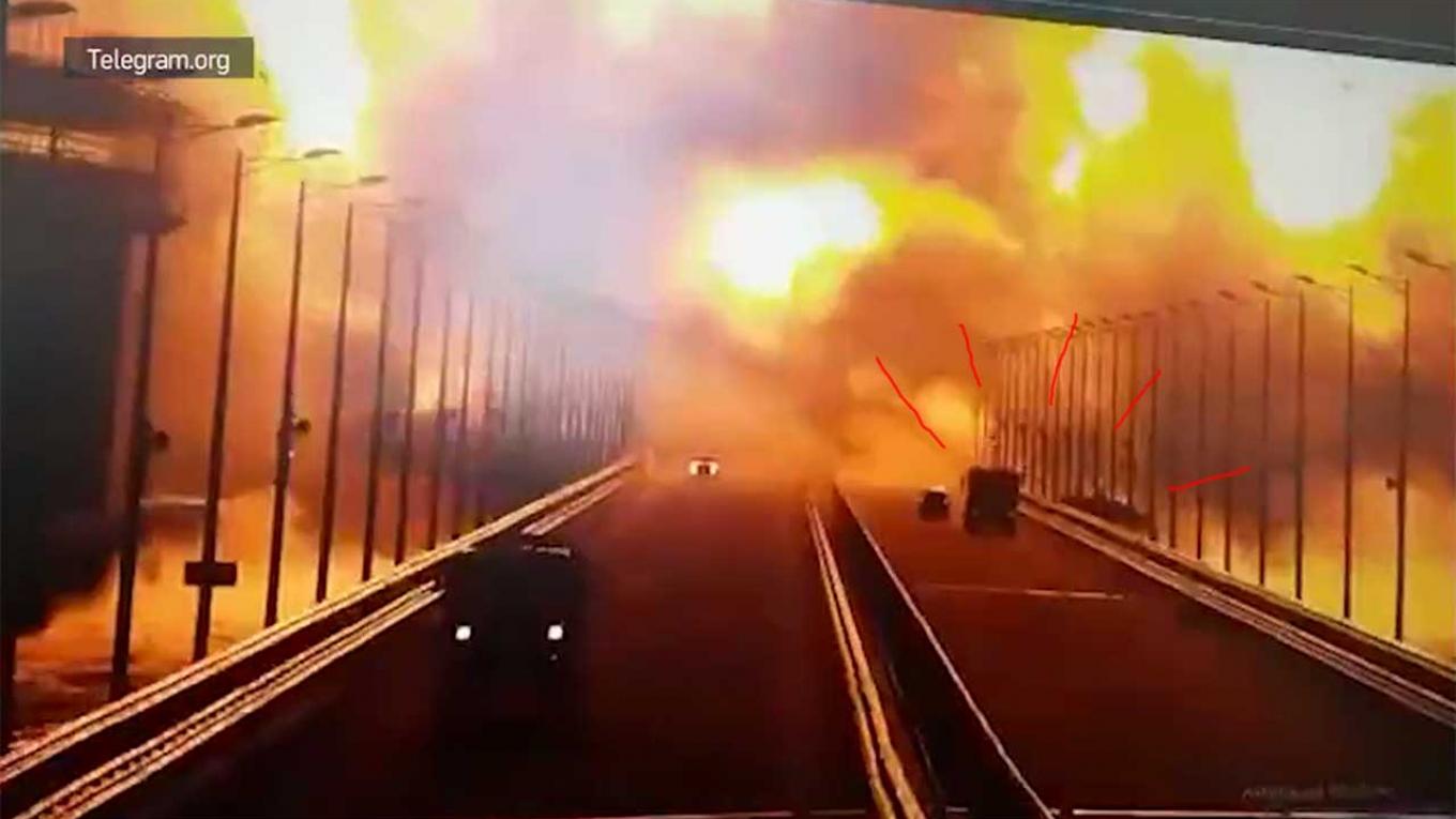 Δείτε την έκρηξη στη γέφυρα στο στενό του Κερτς που συνδέει τη Ρωσία με την Κριμαία κατέγραψε κλειστό κύκλωμα τηλεόρασης.