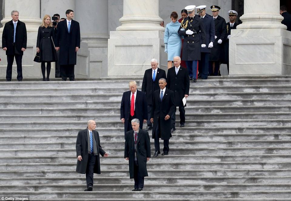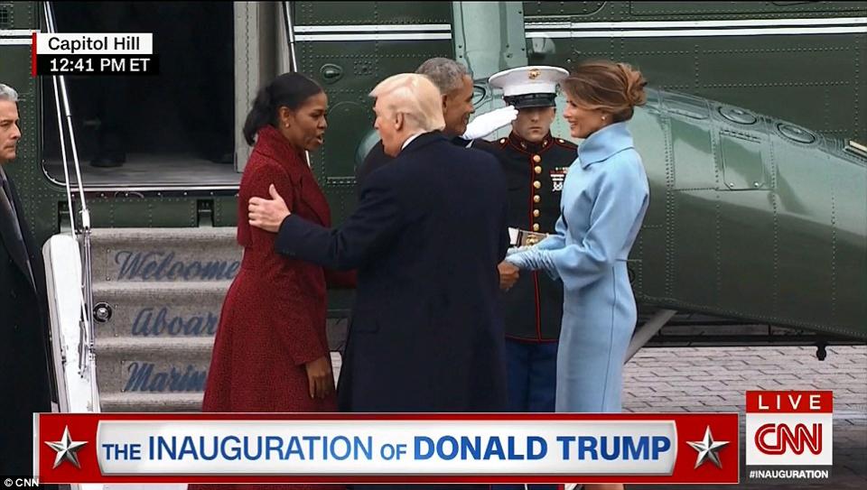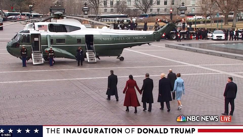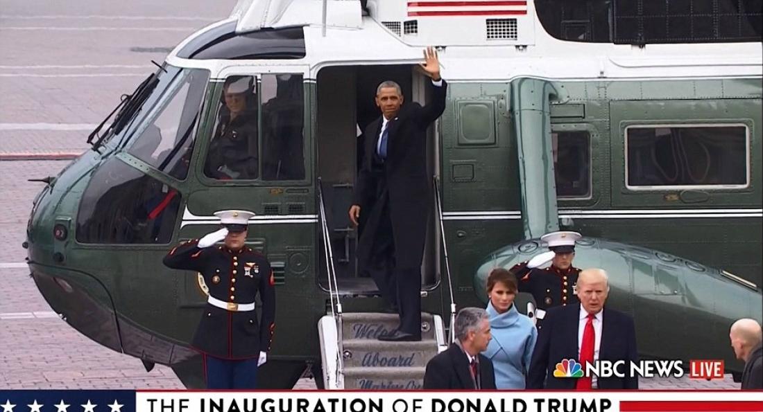 Αμέσως μετά την ορκωμοσία ο Ντόναλντ και η Μελάνια Τραμπ, όπως απαιτεί η παράδοση, συνόδευσαν το ζεύγος Ομπάμα στο προεδρικό ελικόπτερο Marine One.