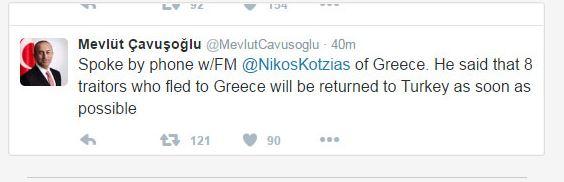 Αμέσως η Τουρκία ζήτησε την έκδοσή τους. Σε ανάρτησή του στο Twitter ο Τούρκος υπουργός Εξωτερικών Μεβλούτ Τσαβούσογλου έγραψε οι «οκτώ προδότες θα εκδοθούν στην Τουρκία το συντομότερο δυνατόν».