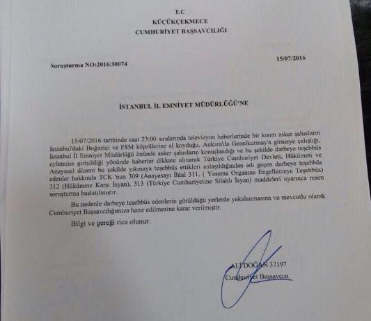 Λίγο πριν τη μία τα ξημερώματα (ώρα Ελλάδος) υπήρξε επίσημη εισαγγελική παραγγελία για τη σύλληψη στρατιωτών που κυκλοφορούν με όπλα στους δρόμους της Τουρκίας. Λίγο μετά τις 11 το βράδυ της Παρασκευής, ο ανώτατος εισαγγελέας της Τουρκίας παρήγγειλε τη σύλληψη οποιουδήποτε στρατιώτη ή αξιωματικού, που έχει ενεργή συμμετοχή στην ενέργεια αυτή.