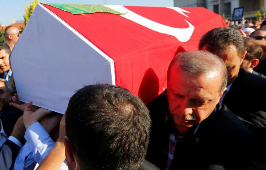 Ο πρόεδρος της Τουρκίας Ρετζέπ Ταγίπ Ερντογάν δεν κατάφερε να συγκρατήσει τα δάκρυά του σήμερα στην κηδεία ενός άνδρα, που σκοτώθηκε μαζί με τον γιο του κατά την εκδήλωση της απόπειρας πραξικοπήματος, σύμφωνα με τις εικόνες που μετέδωσαν σε απευθείας σύνδεση τουρκικά τηλεοπτικά δίκτυα.