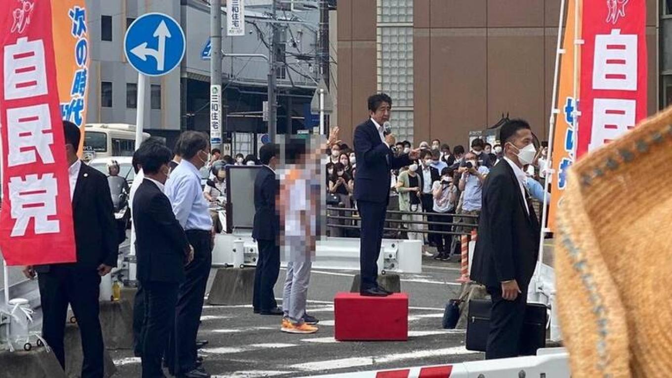Λεπτός, με γυαλιά και ατίθασα μαλλιά ο ύποπτος εμφανίζεται να περπατάει στον δρόμο πίσω από τον Άμπε, ο οποίος στεκόταν πάνω σε ένα βάθρο σε μια διασταύρωση και να τον πυροβολεί δύο φορές με το όπλο του, μήκους 40 εκατοστών, το οποίο ήταν τυλιγμένο με μαύρη ταινία. Η αστυνομία τον ακινητοποίησε επί τόπου.