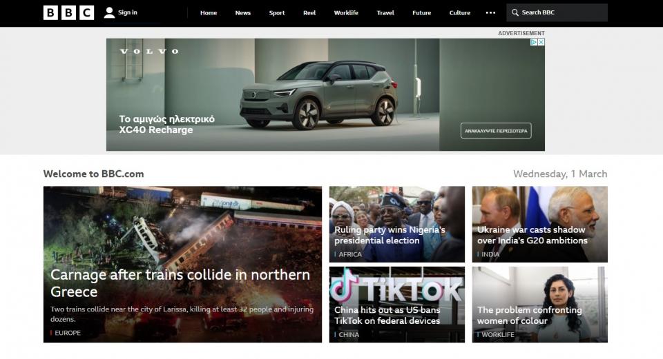 «Δεκάδες άτομα σκοτώθηκαν μετά τη σύγκρουση δύο τραίνων στην Ελλάδα», είναι ο τίτλος του πρώτου θέματος του BBC, το οποίο στον ιστότοπό του έχει συνεχή ενημέρωση για την τραγωδία.