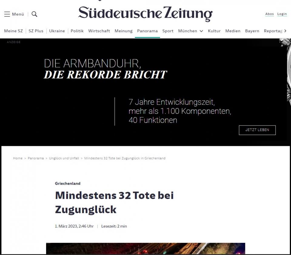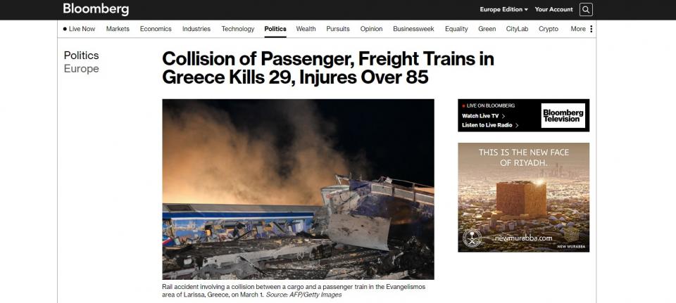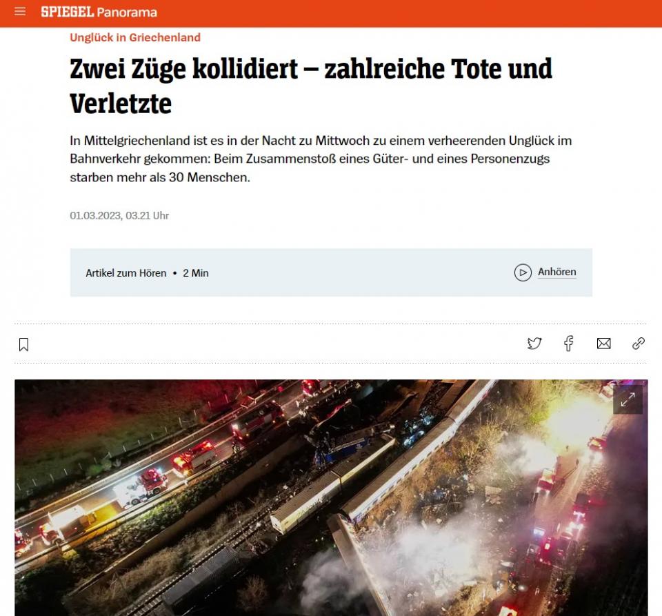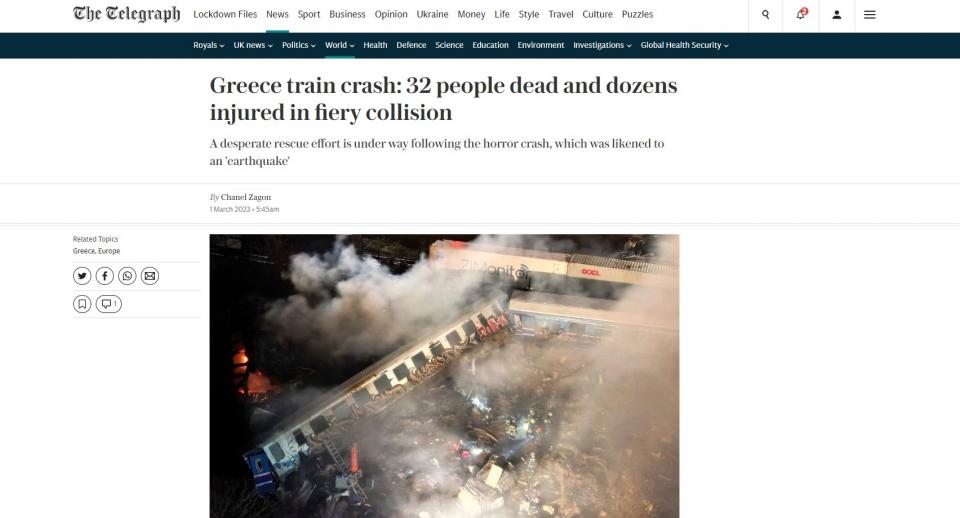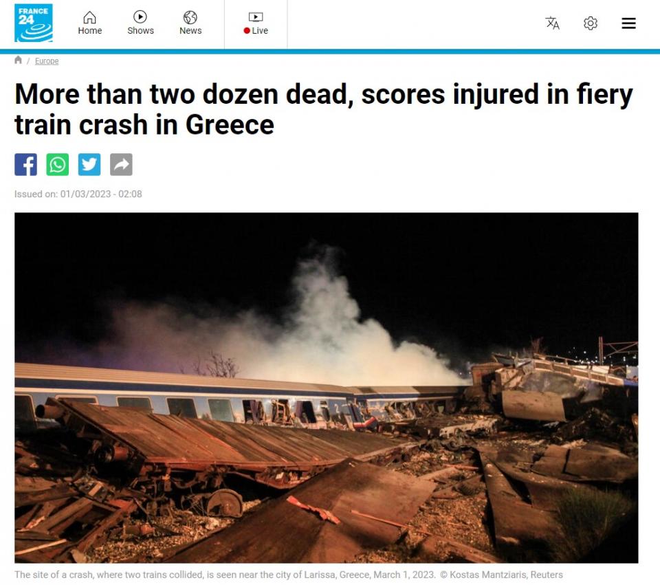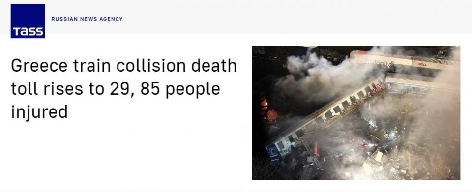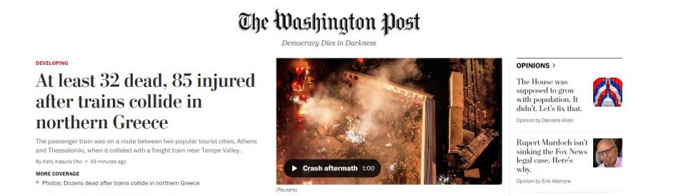 Πρώτο θέμα στα Μέσα Ενημέρωσης όλου του κόσμου -και με συνεχή ενημέρωση- το τραγικό σιδηροδρομικό δυστύχημα στα Τέμπη, με τον προσωρινό απολογισμό να καταγράφει 36 νεκρούς και περισσότερους από 60 τραυματίες, κάποιοι εξ αυτών σε σοβαρή κατάσταση.