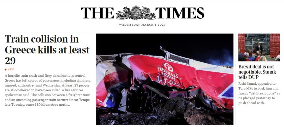 Πρώτο θέμα και στην Independent είναι το σιδηροδρομικό δυστύχημα, η οποία στον ιστότοπό της έχει και live ενημέρωση, όπως και το BBC. Επίσης, οι Times αναφέρονται στην τραγωδία αυτή.