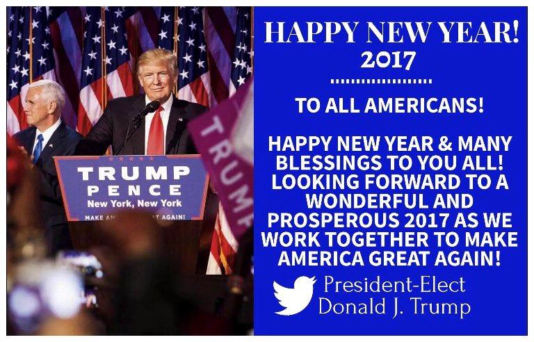 Λίγο αργότερα, ο Τραμπ προσπάθησε να μαζέψει τα πράγματα γράφοντας: "Ευτυχισμένος ο καινούργιος χρόνος και πολλές ευχές σε όλους. Περιμένοντας ένα υπέροχο 2017 με ευημερία, για να εργαστούμε από κοινού ώστε να γίνει και πάλι η Αμερική μεγάλη".