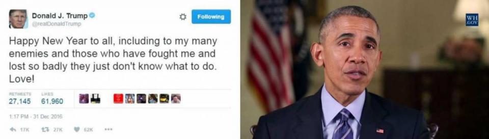 Ο Ομπάμα που δεν είναι τόσο πολύ φαν του Twitter (στέλνει περίπου 100 tweets το χρόνο) απάντησε με τον δικό του τρόπο, αναβάζοντας απλώς το βίντεο του πρωτοχρονιάτικου μηνύματός του, στο οποία μεταξύ άλλων επεσήμανε πως "θα είναι εκεί για να παρακολουθεί κάθε βήμα"...προφανώς του Τραμπ.