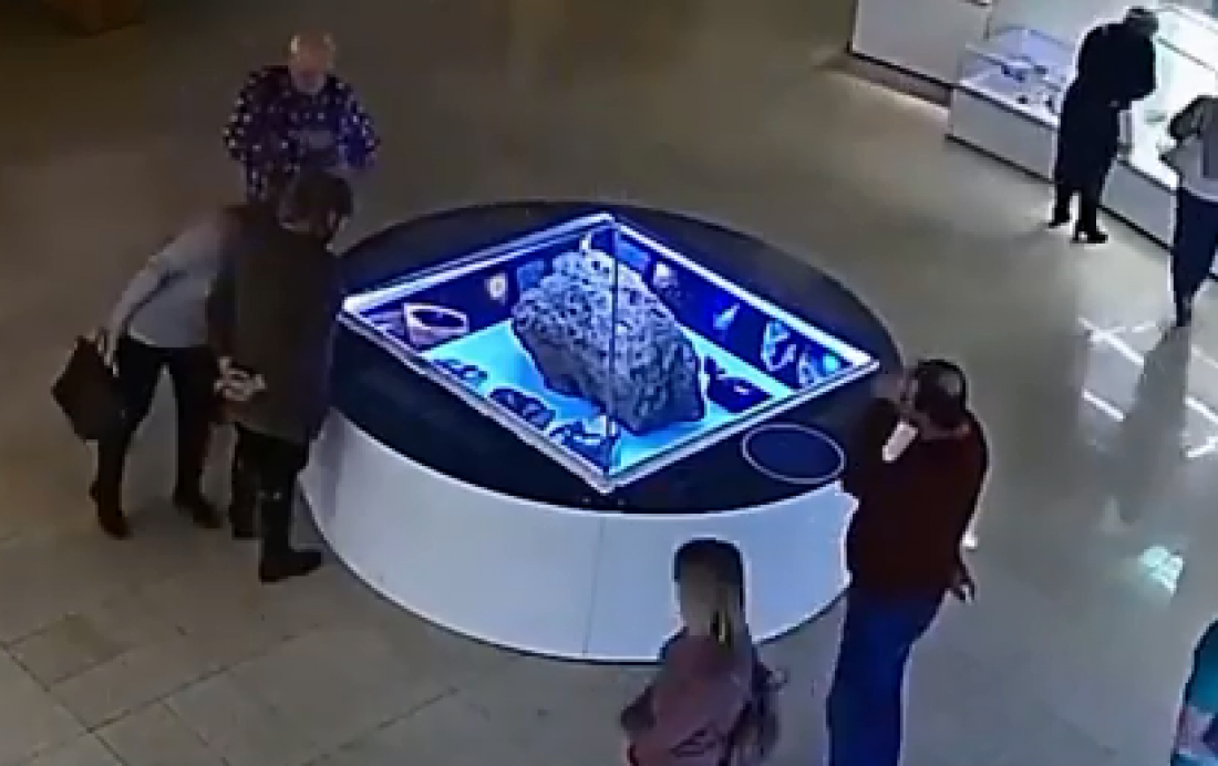 Τα πλάνα από τις κάμερες ασφαλείας του μουσείου που δημοσιεύτηκαν στο διαδίκτυο δείχνουν τους επισκέπτες να περιφέρονται γύρω από τα εκθέματα με το κομμάτι του μετεωρίτη να βρίσκεται στο κέντρο της αίθουσας.