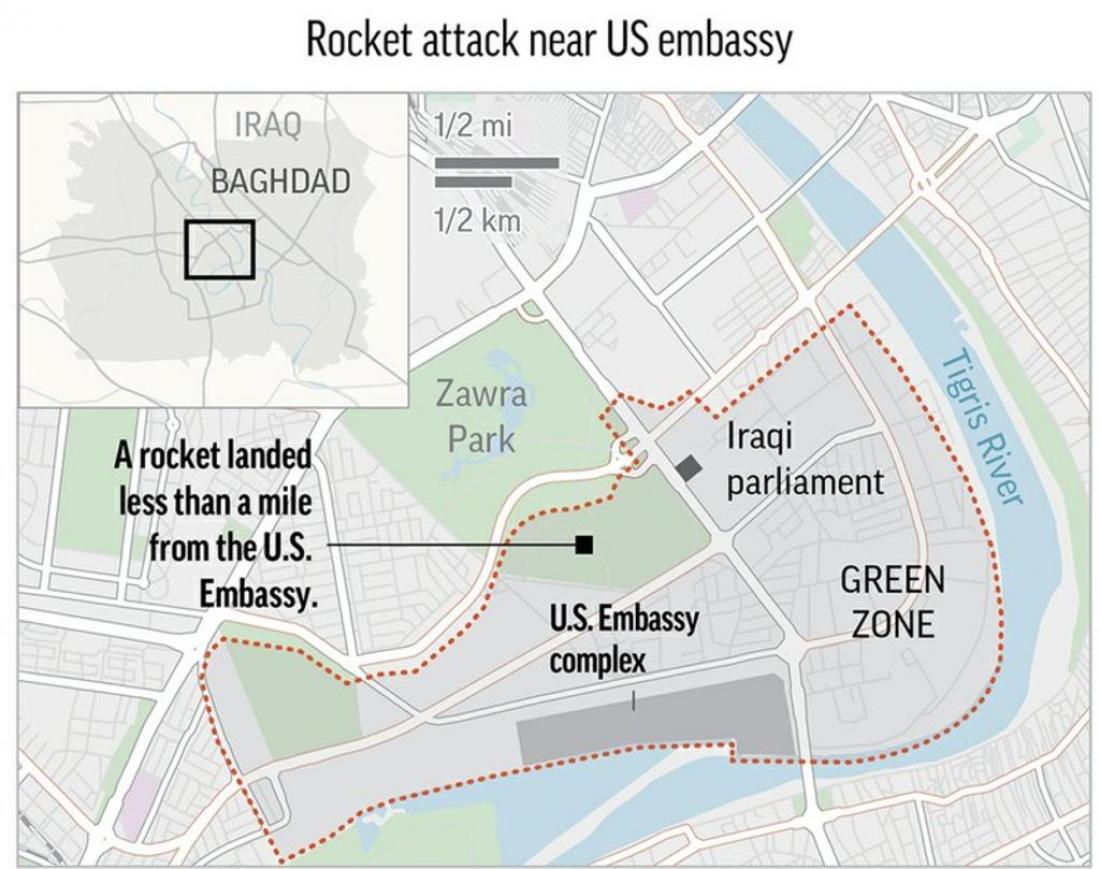 Λίγο νωρίτερα, ρουκέτα έπληξε την "Πράσινη Ζώνη" της Βαγδάτης, όπου βρίσκονται πολλές διπλωματικές αποστολές και κυβερνητικά κτίρια. Όλοι οι δρόμοι που οδηγούν στην πρεσβεία των ΗΠΑ στην περιοχή αυτή έχουν αποκλειστεί.