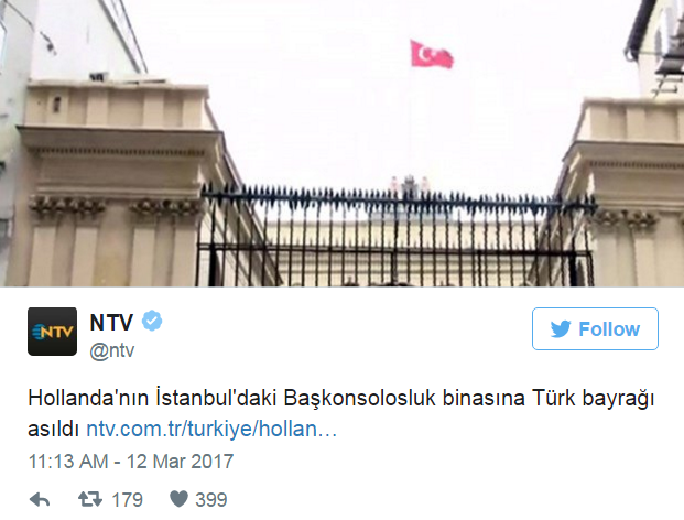 Στο μεταξύ διαδηλωτές κατέβασαν την ολλανδική σημαία από το προξενείο της χώρας στην Κωνσταντινούπολη σήμερα, όπως ανέφερε μια ανταποκρίτρια του AFP.