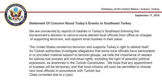 Οι νέες ακρότητες του καθεστώτος Ερντογάν προκάλεσαν την αντίδραση των ΗΠΑ. Η αμερικανική πρεσβεία στην Άγκυρα σε ανακοίνωσή της αφού αναγνωρίζει το δικαίωμα της Τουρκίας να αντιμετωπίζει τον κίνδυνο της τρομοκρατίας κάνει συστάσεις για σεβασμό στα ανθρώπινα δικαιώματα και στην ελευθερία του λόγου! Επίσης εκφράζει την ελπίδα ότι σύντομα οι πολίτες θα μπορέσουν να επιλέξουν νέους τοπικούς άρχοντες... Απλά οι Αμερικάνοι δεν έχουν ίσως καταλάβει απόλυτα, ότι η Τουρκία πλέον είναι και επισήμως μία χώρα, μίας "Αρχής", μίας γνώμης και μίας ψήφου...