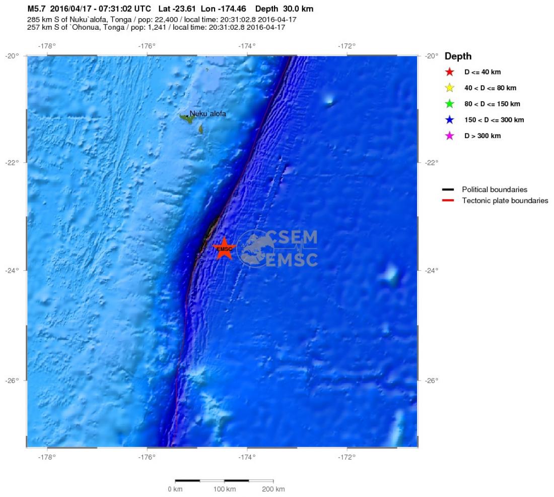 Ο σημειώθηκε 277 χιλιόμετρα νοτια-νοτιοανατολικά της πρωτεύουσας της Τόνγκα Νουκουαλόφα σε βάθος 66 χιλιομέτρων σύμφωνα με το Γεωδυναμικό Ινστιτούτο των ΗΠΑ (USGS).