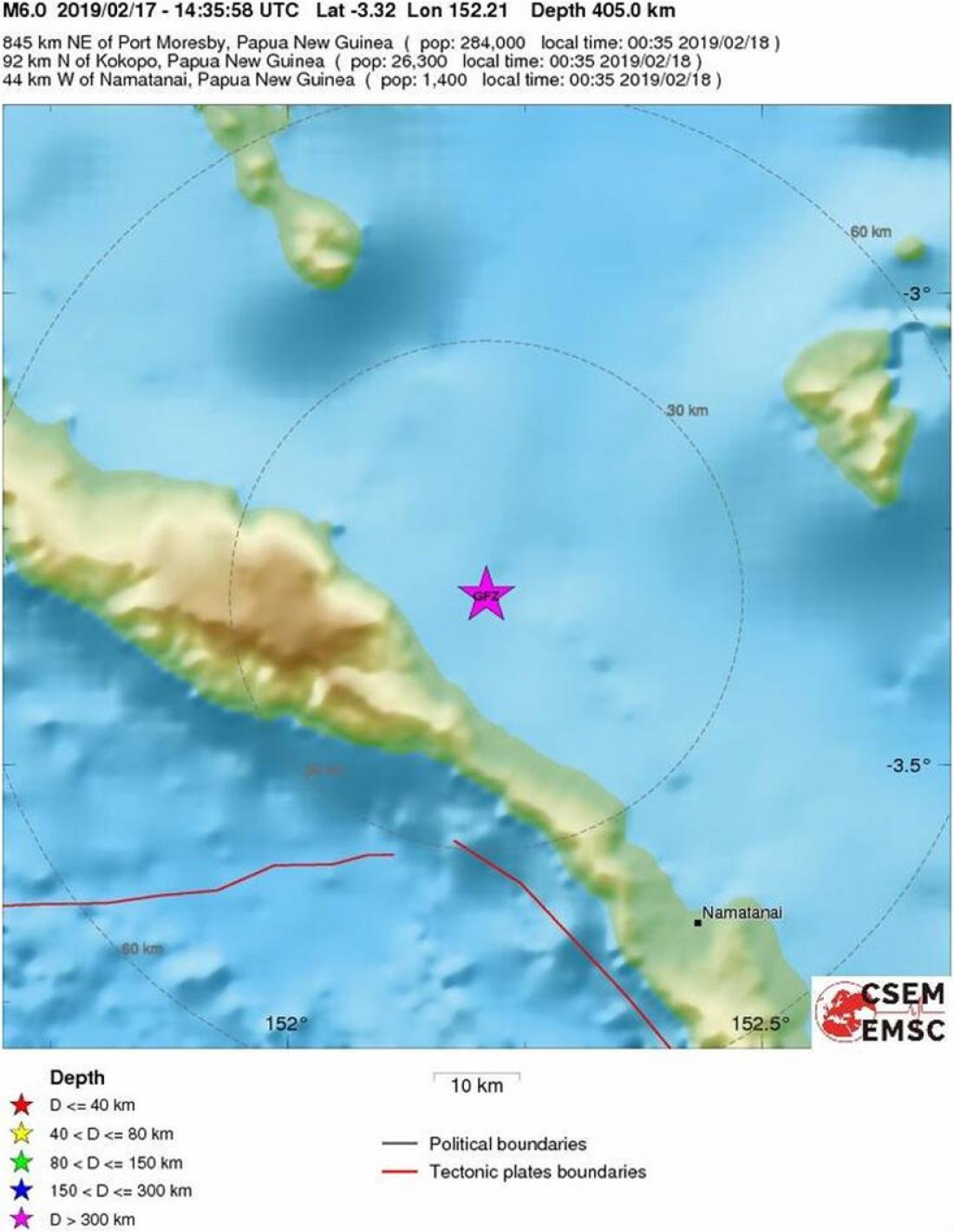Σύμφωνα με το Ευρωπαϊκό Μεσογειακό Σεισμολογικό Κέντρο (EMSC), ο είχε εστιακό βάθος 373 χιλιόμετρα και σημειώθηκε 44 χλμ. βορειοδυτικά του Namatanai.