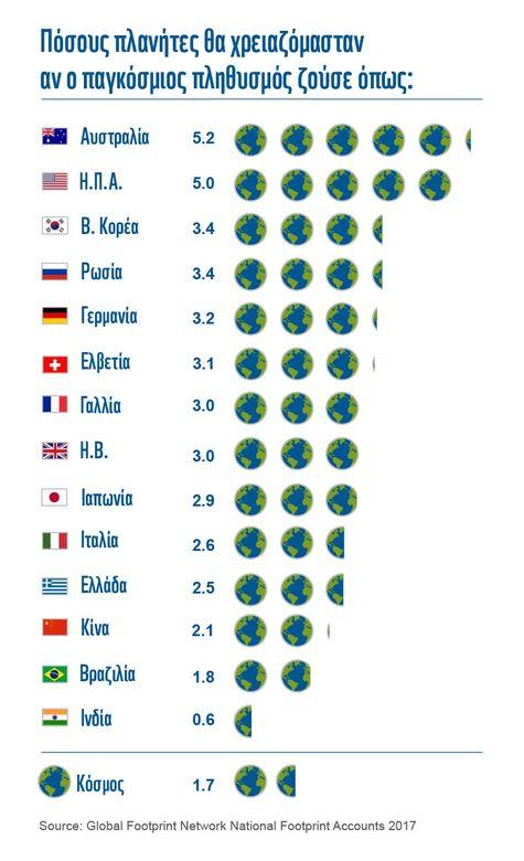 Συνολικά η ανθρωπότητα χρειάζεται 1,7 τον χρόνο για να συνεχίζει να ζει με τον ίδιο τρόπο, ενώ αν όλοι ζούσαν όπως οι , θα χρειαζόμασταν 2,5 πλανήτες. Με άλλα λόγια, η ανθρωπότητα χρησιμοποιεί τη φύση 1,7 φορές γρηγορότερα (ή στην περίπτωση των Ελλήνων 2,5 φορές ταχύτερα) από τον ρυθμό με τον οποίο τα οικοσυστήματα μπορούν να αναπληρώσουν τις απώλειες. Πρώτη στη σχετική κατάταξη αναδεικνύεται η Αυστραλία (με 5,2 πλανήτες), οι ακολουθούν με 5 πλανήτες ενώ εντύπωση αλλά και ανησυχία προκαλεί το γεγονός ότι η Κίνα και η Ινδία - που μαζί αντιπροσωπεύουν το 36% περίπου του παγκόσμιου πληθυσμού - βρίσκονται ακόμη σχετικά μακριά από την κορυφή.