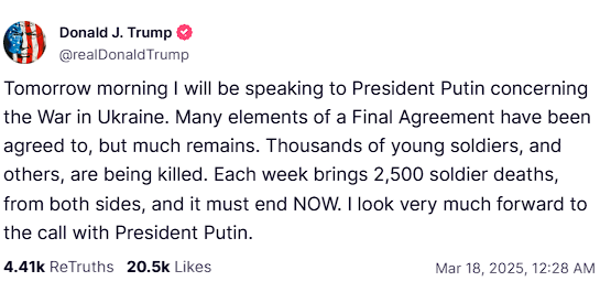 Στη συνέχεια σε ανάρτησή του στα Truth Social, σήμερα, Τρίτη (18/3) τα ξημερώματα ο Τραμπ γνωστοποίησε ότι έχουν καταλήξει σε συμφωνία για πολλά στοιχεία, ωστόσο υπάρχουν αρκετά ακόμη που απομένουν, ενώ τόνισε πως ανυπομονεί για το τηλεφώνημα.
