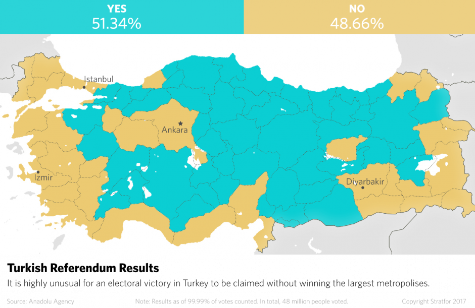 Οι Τούρκοι ενέκριναν χθες με ποσοστό μόλις 51,4% την αναθεώρηση του Συντάγματος που αποδίδει στον πρόεδρο Ταγίπ Ερντογάν σαρωτικές νέες εξουσίες. Το μεγαλύτερο κόμμα της αντιπολίτευσης έχει ζητήσει την ακύρωση του δημοψηφίσματος, υποστηρίζοντας πως η ψηφοφορία σημαδεύτηκε από παρατυπίες.