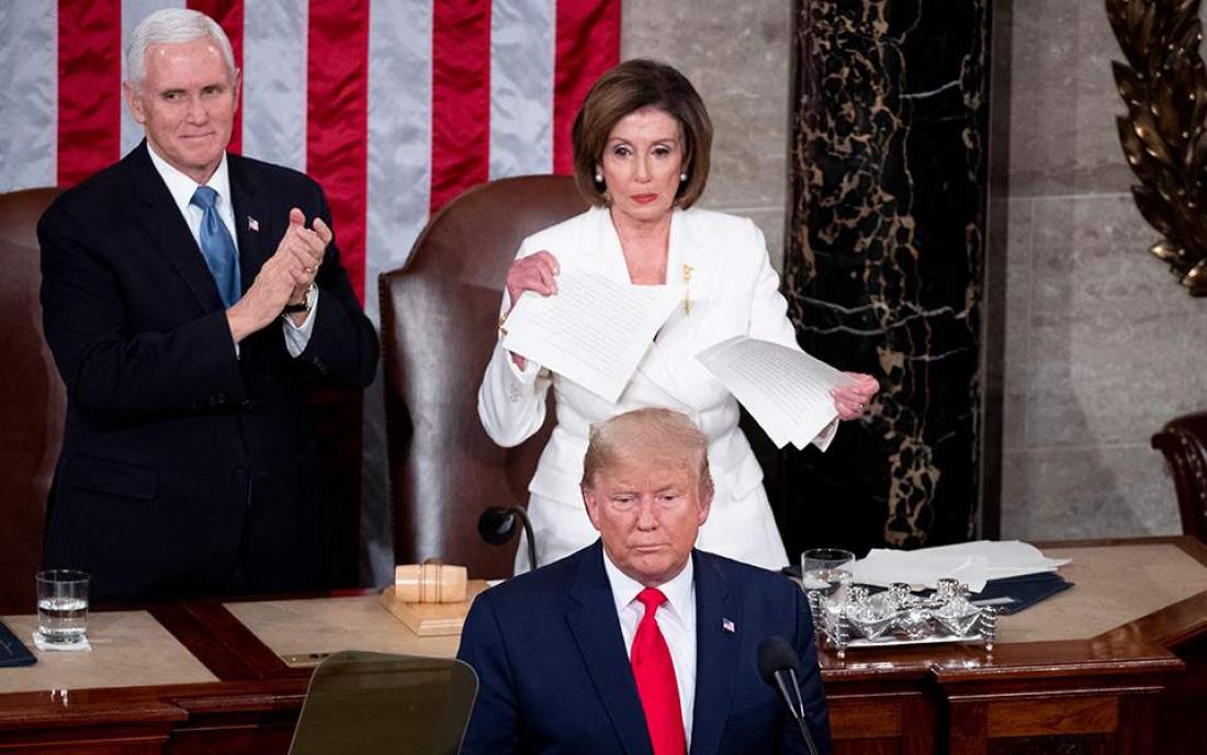 Σκηνές ...αμερικανικής Δδημοκρατίας στο Κογκρέσο με τον Τραμπ να αρνείται να δώσει το χέρι του για την τυπική χειραψία και την πρόεδρο της Βουλής των Αντιπροσώπων, τη Δημοκρατική Νάνσι Πελόσι, να εκδηλώνει με θεαματικό τρόπο τη διαφωνία της με τον Ρεπουμπλικάνο πρόεδρο σχίζοντας επιδεικτικά την ομιλία του.