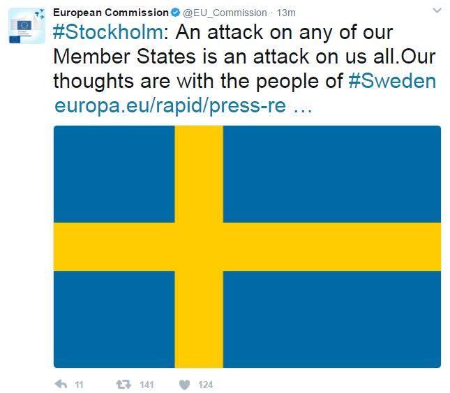 «Οι σκέψεις μας βρίσκονται στους πολίτες της Σουηδίας μετά τα τραγικά γεγονότα στη Στοκχόλμη σήμερα» επισήμανε ο Γιούνκερ σε ένα δελτίο τύπου που έδωσε στη δημοσιότητα η Κομισιόν.