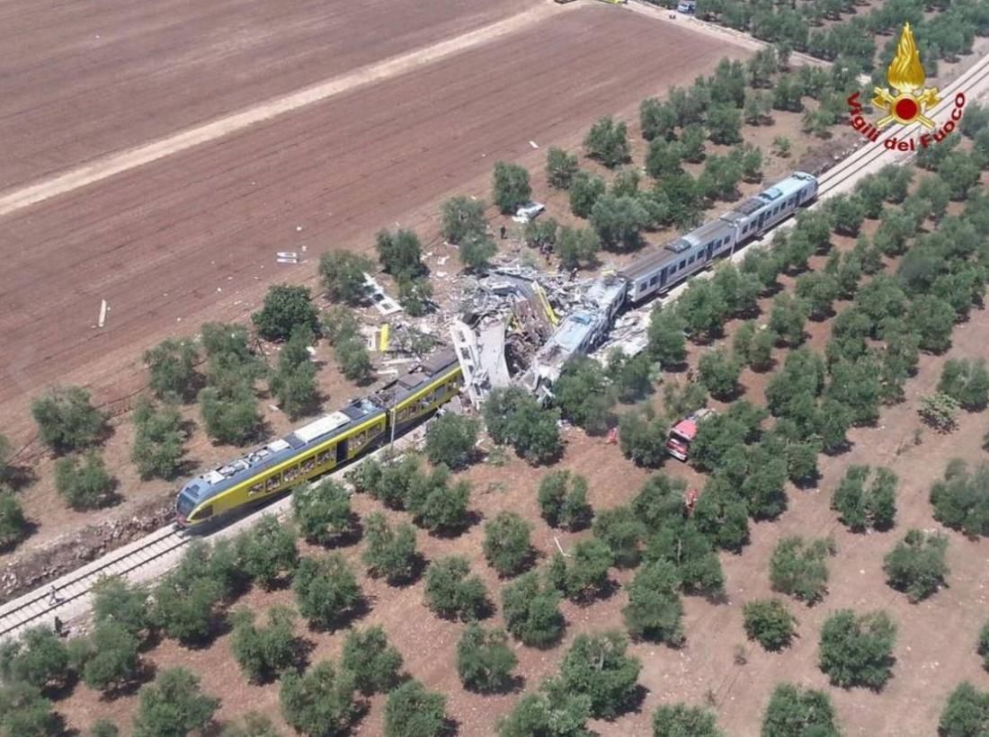 Τουλάχιστον 24 άνθρωποι σκοτώθηκαν και περισσότεροι από 50 είναι αυτοί που τραυματίσθηκαν όταν δύο επιβατικές αμαξοστοιχίες συγκρούσθηκαν μετωπικά στη μέση ενός ελαιώνα σήμερα στη νότια Ιταλία, σύμφωνα με την Ιταλική τηλεόραση RAI.