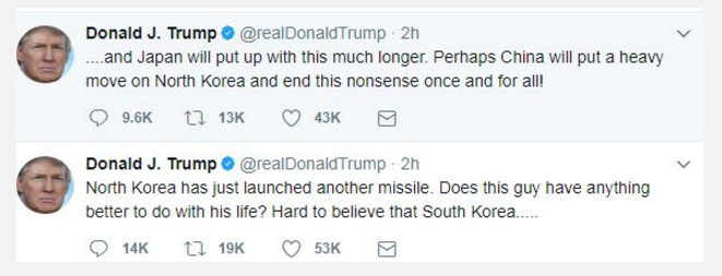 «H Bόρεια Κορέα μόλις εκτόξευσε ακόμα ένα πύραυλο. Αυτός ο τύπος (Κιμ Γιονγκ Ουν) δεν έχει τίποτα καλύτερο να κάνει στη ζωή του; Είναι δύσκολο να πιστέψει κανείς ότι η Νότια Κορέα και η Ιαπωνία θα το ανέχονται αυτό για πολύ ακόμα» ανέφερε σε μήνυμά του στο Twitter ο Ντόναλντ Τραμπ λίγες ώρες αφότου η Βόρεια Κορέα προχώρησε σε νέα εκτόξευση βαλλιστικού πυραύλου.