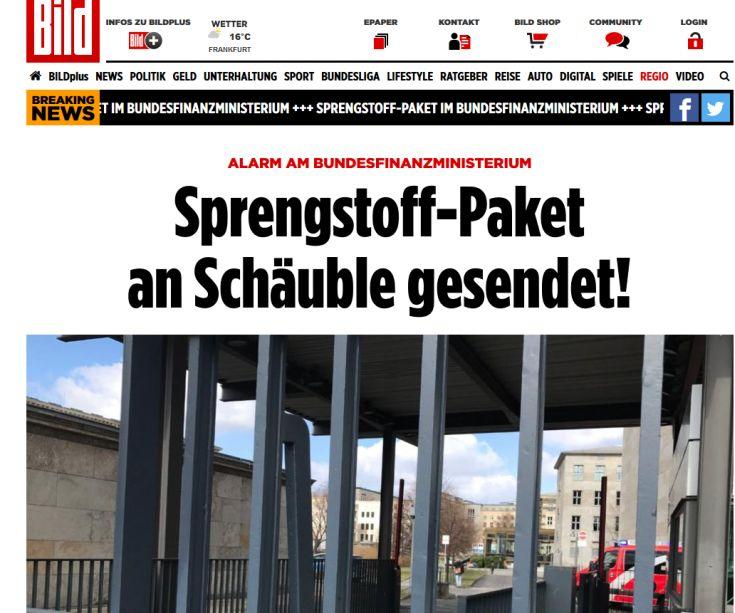 Όπως μεταδίδει η γερμανική Bild, αργά το απόγευμα το πακέτο βρέθηκε στην αλληλογραφία του υπουργείου και παραλήπτης ήταν ο ίδιος ο υπουργός Βόλφγκανγκ Σόιμπλε.