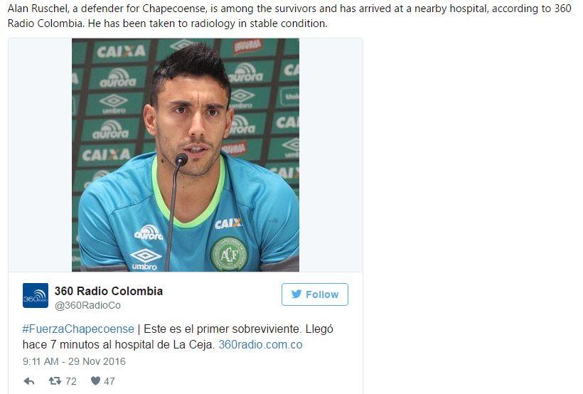 Ο Άλαν Ρουσέλ, αμυντικός της βραζιλιάνικης ομάδας Τσαπεκονένσε, η αποστολή της οποίας βρισκόταν στο μοιραίο αεροσκάφος που συνετρίβη στην Κολομβία, βρίσκεται ανάμεσα στους διασωθέντες.