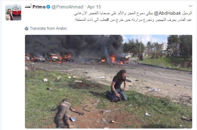Μπορείτε να δείτε την φωτογραφία που «ανέβασε» ο δημοσιογράφος Primo Ahmad από τη Συρία , στον προσωπικό του λογαριασμό στο twitter, στις 15 Απριλίου γράφοντας: