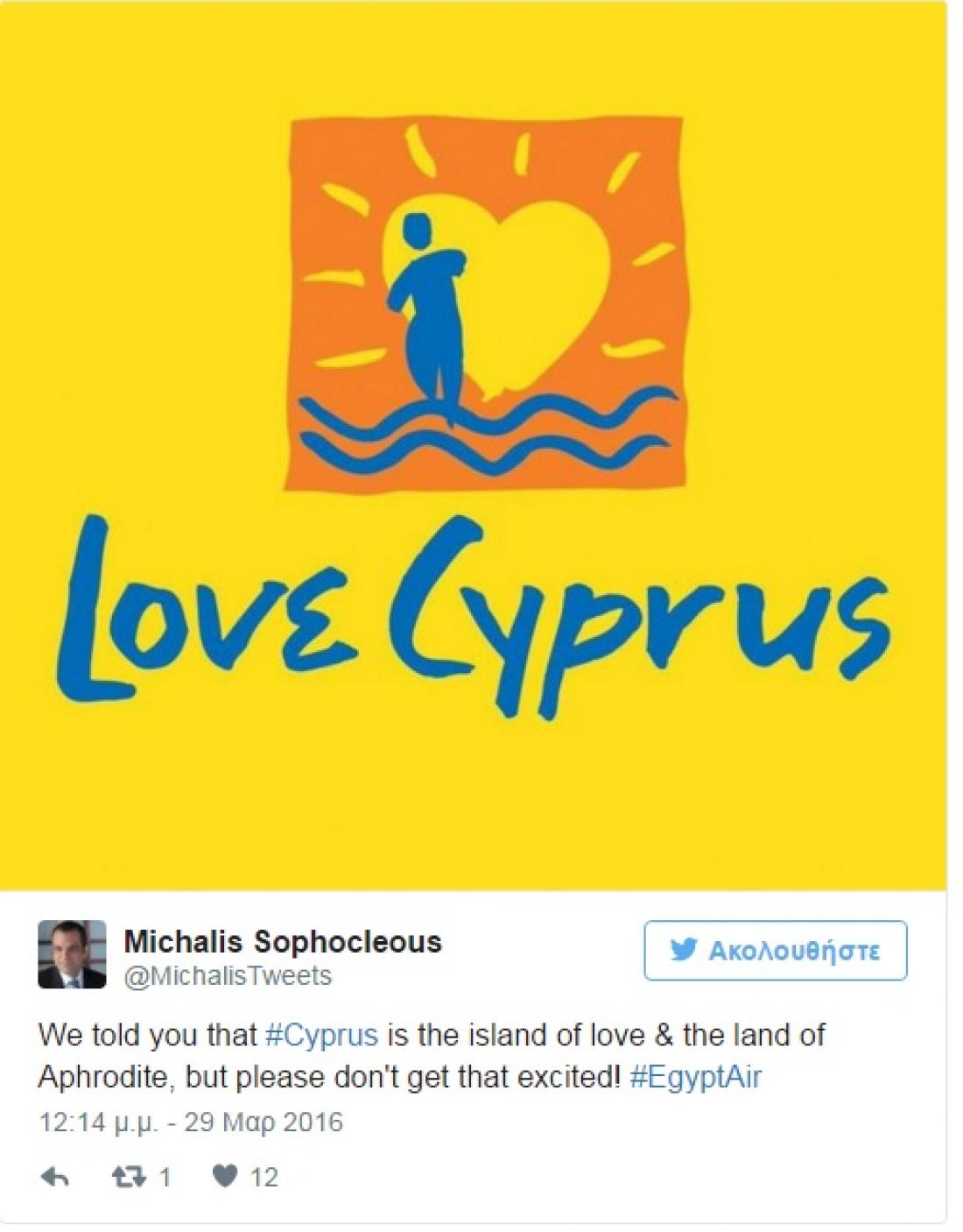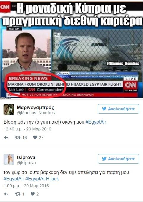 Χαμός έγινε στα σόσιαλ μίντια και δη στο Twitter όταν έγινε γνωστό πως ο δράστης της αεροπειρατείας στο αεροσκάφος της EgyptAir ονομάζεται Σέιφ Ελντίν Μουστάφα και στόχος της αεροπειρατείας ήταν να μεταφέρει ένα 4σέλιδο μήνυμα στην Κύπρια πρώην σύζυγό του.