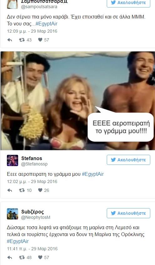 Έλληνες και Κύπριοι χρήστες της σελίδας κοινωνικής δικτύωσης κυριολεκτικά ξεσπάθωσαν, ενώ τα hashtag #EgyptAir και #Larnaca έχουν αναδειχθεί ως τα πλέον δημοφιλή παγκοσμίως, με περισσότερα από 70.000 σχετικά tweets .
