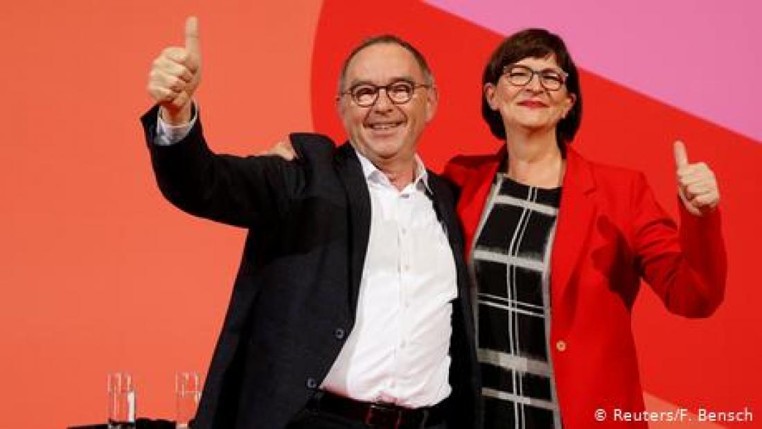 Νόρμπερτ Βάλτερ-Μπόργιανς και Σάσκια Έσκεν είναι οι νέοι επικεφαλής του SPD, εκτός νυμφώνος ο υπουργός Οικονομικών Όλαφ Σολτς. Η νέα ηγεσία είχε θέσει υπό αμφισβήτηση την κυβέρνηση με τους Χριστιανοδημοκράτες (CDU).