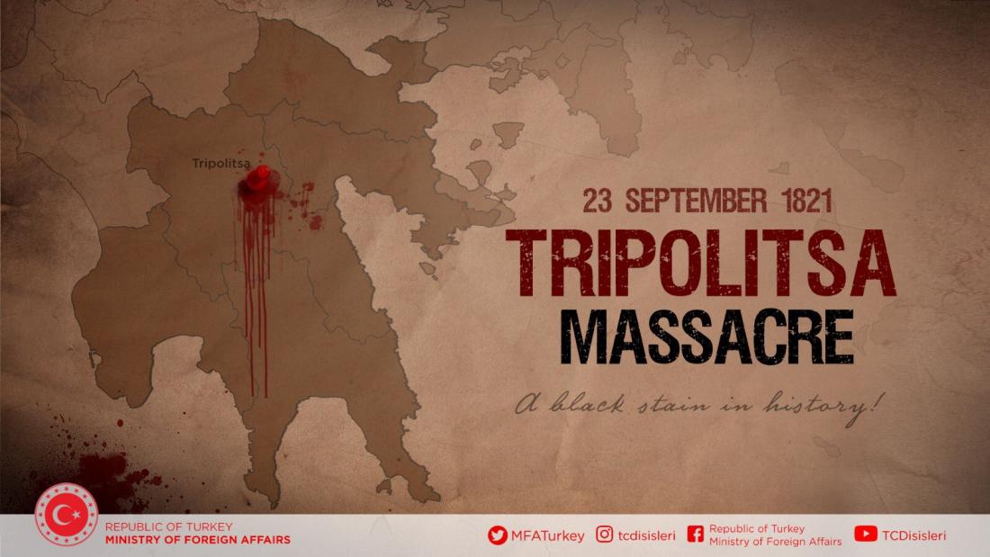 Το τουρκικό υπουργείο Εξωτερικών, σε μια άκρως προκλητική ενέργεια, επιχειρεί να παρουσιάσει ως θύματα τους Τούρκους κατακτητές της Ελλάδας και χαρακτηρίζει την Απελευθέρωση της Τριπολιτσάς κατά την Επανάσταση του 1821, ως «απάνθρωπη σφαγή Τούρκων»!!!
