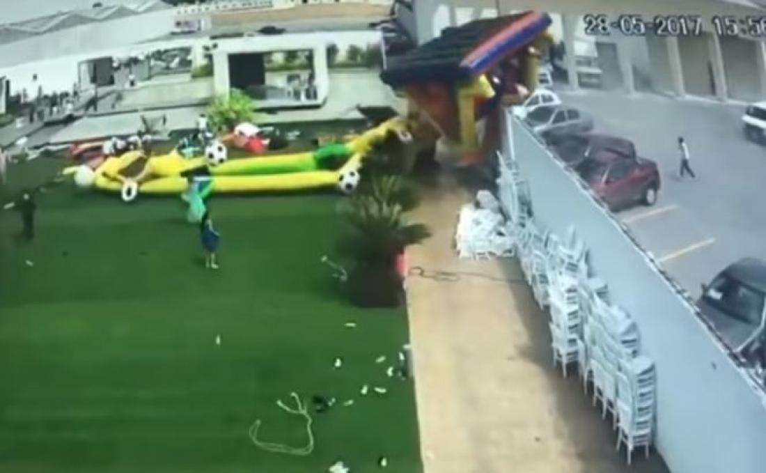 Ο πολύ δυνατός αέρας σήκωσε όλες τις φουσκωτές κατασκευές του παιδότοπου, σπάζοντας τα σχοινιά ασφαλείας, την ώρα που έπαιζαν μέσα δεκάδες πιτσιρίκια. Οι σοκαρισμένοι γονείς δεν πρόλαβαν να αντιδράσουν, βλέποντας τα παιδιά τους να μεταφέρονται πολλά μέτρα μακριά, καθώς άλλες κατασκευές αναποδογύρισαν και άλλες τις έβγαλε ο αέρας εκτός του παιδότοπου και τις μετέφερε στο διπλανό πάρκινγκ αφού πρώτα πέρασαν πάνω από ένα φράχτη!