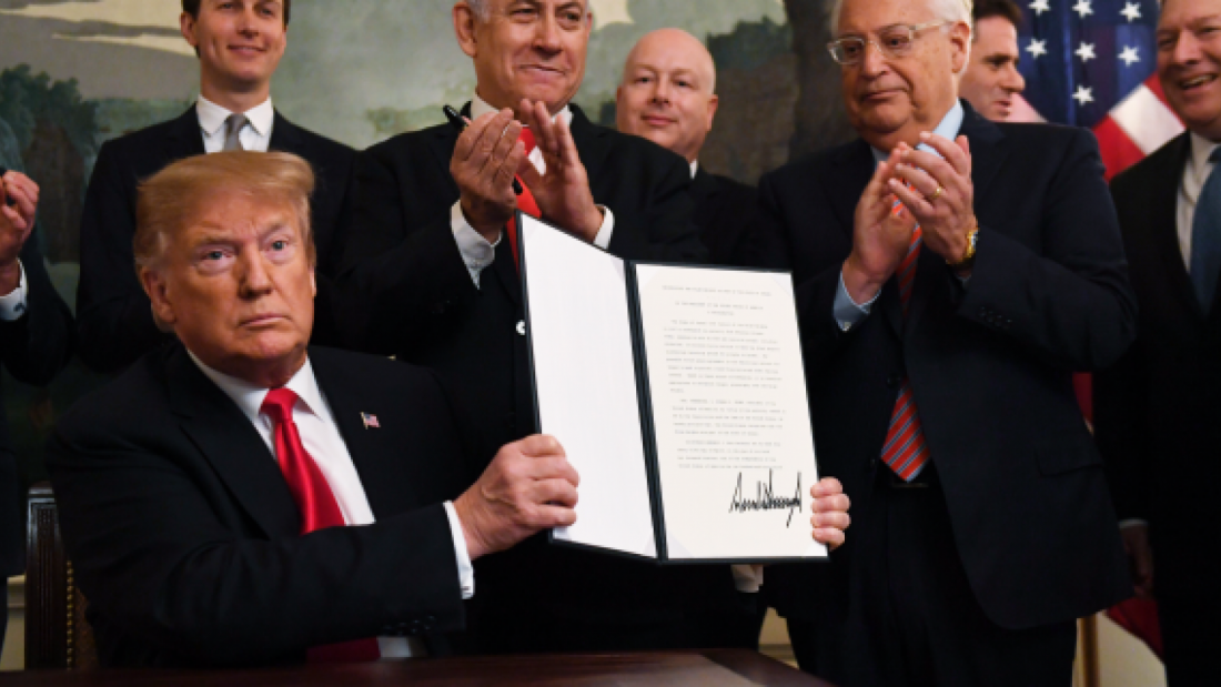 Η υπογραφή του διατάγματος έγινε μόλις ξεκίνησε η συνάντησή του με τον πρωθυπουργό του Ισραήλ Μπ. Νετανιάχου, στο Λευκό Οίκο.