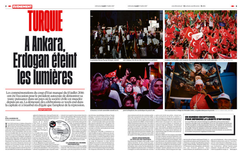 «Μα ποιος τέλος πάντων θα σταματήσει τον Ερντογάν;» είναι ο πρωτοσέλιδος τίτλος της εφημερίδας Liberation, η οποία έχει τετρασέλιδο αφιέρωμα στην Τουρκία.