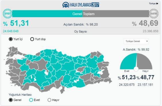 Προηγουμένος έλεγαν ότι το αποτέλεσμα του δημοψηφίσματος είναι ξεκάθαρο κάτι που με τον τρόπο του είπε στις δηλώσεις του και ο Ερντογάν: Τα ανεπίσημα αποτελέσματα δείχνουν ότι ο αριθμός των ψήφων υπέρ του "ναι" ανέρχεται σε 25 εκατομμύρια, ήτοι 1,3 εκατομμύρια περισσότεροι ψήφοι έναντι του "όχι". Σύμφωνα με τον ίδιο, το "ναι" επικράτησε με ποσοστό 51,5%.