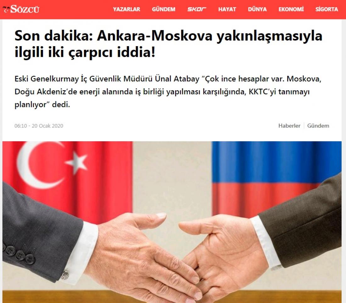 Η Ρωσία σχεδιάζει να αναγνωρίσει το ψευδοκράτος με αντάλλαγμα η Τουρκία να προσφέρει τη συνεργασία της στην ανατολική Μεσόγειο, υποστηρίζει ο πρώην διευθυντής Εσωτερικής Ασφάλειας του Γενικού Επιτελείου Στρατού της Τουρκίας, Ουνάλ Αταμπάι.