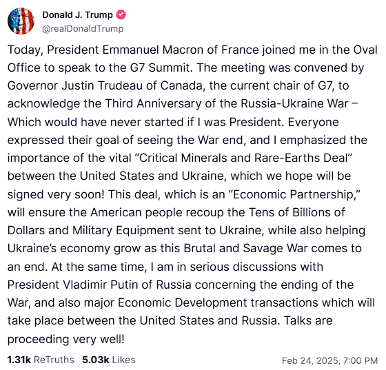 Σήμερα, ο Πρόεδρος της Γαλλίας Εμμανουέλ Μακρόν παρευρέθηκε μαζί μου στο Οβάλ Γραφείο για να συμμετάσχει στη Σύνοδο Κορυφής της G7. Η συνάντηση συγκλήθηκε από τον κυβερνήτη του Καναδά Τζάστιν Τριντό, που έχει την τωρινή προεδρία της G7, για να αναγνωριστεί η τρίτη επέτειος του πολέμου Ρωσίας-Ουκρανίας - ο οποίος δεν θα είχε ξεκινήσει ποτέ του αν ήμουν πρόεδρος. Όλοι εξέφρασαν τον στόχο τους για το τέλος του πολέμου και τόνισα τη σημασία της ζωτικής σημασίας «Συμφωνίας για τα κρίσιμα ορυκτά και τις σπάνιες γαίες» μεταξύ των ΗΠΑ και της Ουκρανίας, η οποία ελπίζουμε ότι θα υπογραφεί πολύ σύντομα! Αυτή η συμφωνία, η οποία είναι μια «Οικονομική Εταιρική Σχέση», θα διασφαλίσει ότι ο αμερικανικός λαός θα πάρει πίσω τα δεκάδες δισεκατομμύρια δολάρια και τον στρατιωτικό εξοπλισμό που στάλθηκαν στην Ουκρανία, ενώ παράλληλα θα βοηθήσει την οικονομία της Ουκρανίας να αναπτυχθεί καθώς αυτός ο βάρβαρος και άγριος πόλεμος φτάνει στο τέλος του. Ταυτόχρονα, βρίσκομαι σε σοβαρές συζητήσεις με τον Πρόεδρο της Ρωσίας Βλαντίμιρ Πούτιν σχετικά με τον τερματισμό του Πολέμου αλλά και για τις μεγάλες οικονομικές αναπτυξιακές συναλλαγές που θα πραγματοποιηθούν μεταξύ των ΗΠΑ και της Ρωσίας. Οι συνομιλίες προχωρούν πολύ καλά!