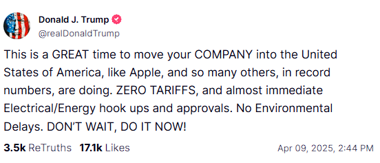 «Είναι ευκαιρία τώρα να μεταφέρετε την εταιρεία σας στις ΗΠΑ, όπως η Apple και πολλές άλλες. Μηδενικοί δασμοί και σχεδόν άμεσες ηλεκτρικές και ενεργειακές συνδέσεις χωρίς καθυστερήσεις», απαντά ο Ντόναλντ Τραμπ σχολιάζοντας τα αντίποινα της Κίνας στο δεύτερο κύμα δασμών.