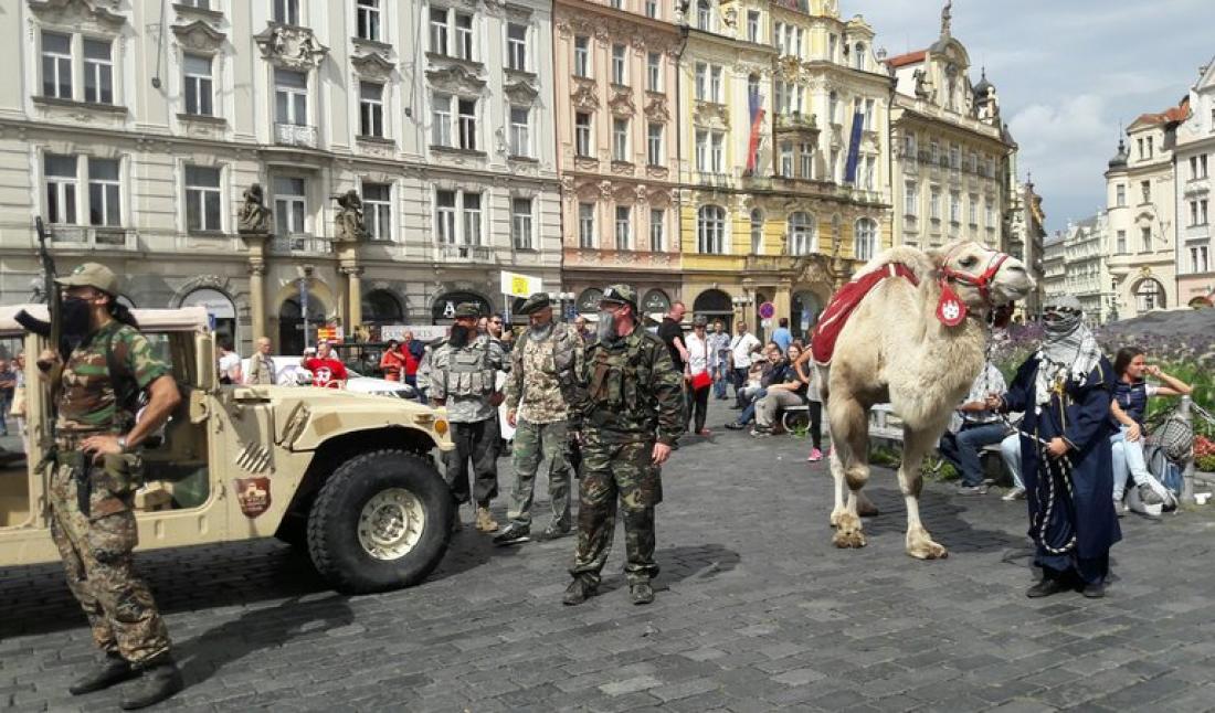 Ο ακτιβιστής Μάρτιν Κονβίκα και υποστηρικτές του μεταμφιέστηκαν σε μαχητές της οργάνωσης Ισλαμικό Κράτος και διείσδυσαν την Κυριακή στο πλήθος τουριστών και ντόπιων στην Πλατεία της Παλιάς Πόλης, φωνάζοντας «Αλλάχ Ακμπάρ» (ο Θεός είναι μεγάλος). Ταυτόχρονα πυροβολούσαν στον αέρα με ψεύτικα όπλα.