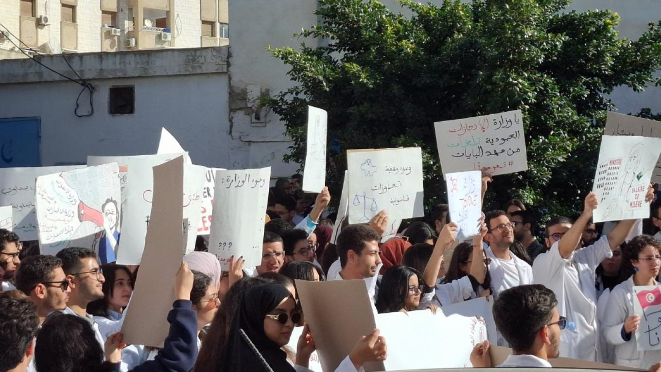 Οι διαδηλωτές, φορώντας λευκές ρόμπες, κράδαιναν πλακάτ που έγραφαν «Αξιοπρέπεια για τους γιατρούς» και «Σώστε τα νοσοκομεία μας» καθώς συγκεντρώνονταν κοντά στο κοινοβούλιο της Τυνησίας.