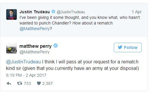 Ο 45χρονος πρωθυπουργός του Καναδά προκάλεσε τον Τσάντλερ λέγοντας μέσα από τον λογαριασμό του στο Twitter πως θέλει να δώσει μια γροθιά στον... Τσάντλερ!
