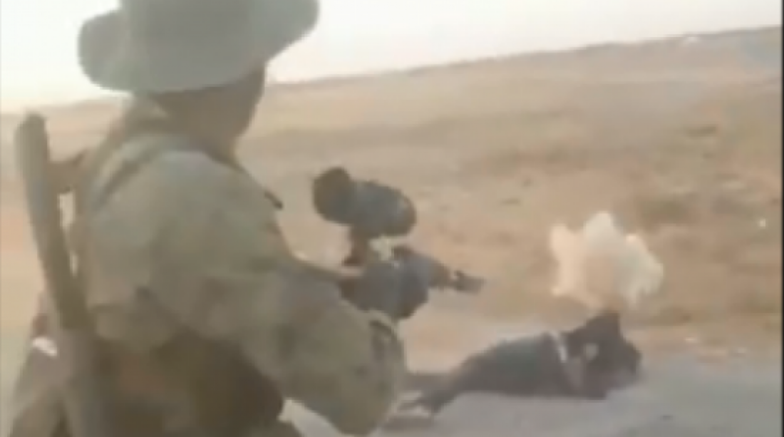 Σε ένα από αυτά φαίνεται ένας στρατιώτης, που ζητά να τον βιντεοσκοπήσουν καθώς απλώνει το όπλο του σε κοντινή απόσταση από έναν άνδρα κουλουριασμένο στο χώμα και τον πυροβολεί στο κεφάλι. Μαζί με έναν άλλο μαχητή φωνάζει: «Γουρούνια»!. Οι κουνημένες εικόνες από το πεδίο των μαχών βορειοανατολικά της Συρίας δείχνουν τη δολοφονία ενός Κούρδου αιχμάλωτου.